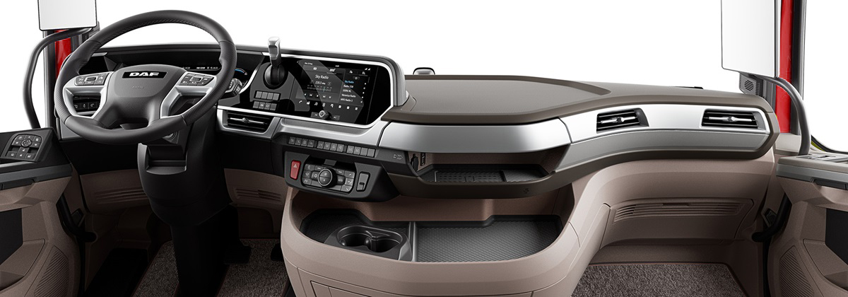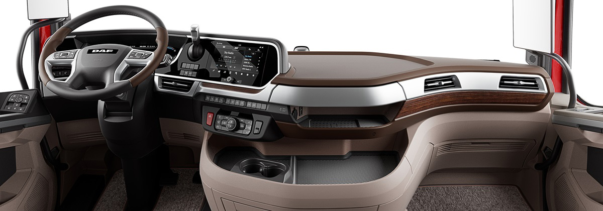 The styling options of the New Generation DAF trucks let you put your personal stamp on the cab interior. Choose from two attractive colour schemes: dark and warm or a more exclusive light and luxurious option. And three deco panel choices: Natura, a sophisticated premium wood look; Argenta with its elegant silver finish; or the darker, tastefully patterned Hexagon. Whatever you choose, you can rest assured the cab interior will have an ultramodern, premium look and feel completely in line with the rest of the truck. Bringing style and function together in perfect harmony.